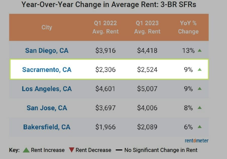 This rental market report highlights the average rent prices of three bedroom (3-BR) single-family rentals (SFRs) for Q1 2023 in these five California cities: Bakersfield, Los Angeles, Sacramento, San Diego, and San Jose.